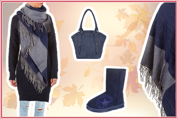 So schnell hast Du ein richtig schickes komplettes Winter-Outfit zum günstigen Online-Schnäppchenpreis zusammen: Bestelle Dir zunächst einen kuscheligen Strick-Longpullover für Damen mit körpernahmen Schnitt in dezentem Dunkelblau. Den Link zu diesem tollen Basic-Artikel, den Du natürlich super billig in unserem Online-Shop einkaufen kannst, findest Du wie immer direkt unterhalb des Bilds. Perfekt ergänzt wird diese Tunika durch eine trendige Skinny Jeans aus Baumwolle mit hohem Stretchanteil, welcher für eine optimale Passform sorgt. Das Dunkelblau der Winterboots aus hochwertiger Wildlederoptik greift dann den Farbton des Longpullovers gekonnt auf, ebenso wie die elegant geschnittene dunkelblaue Schultertasche für Damen mit Reißverschlussapplikationen.