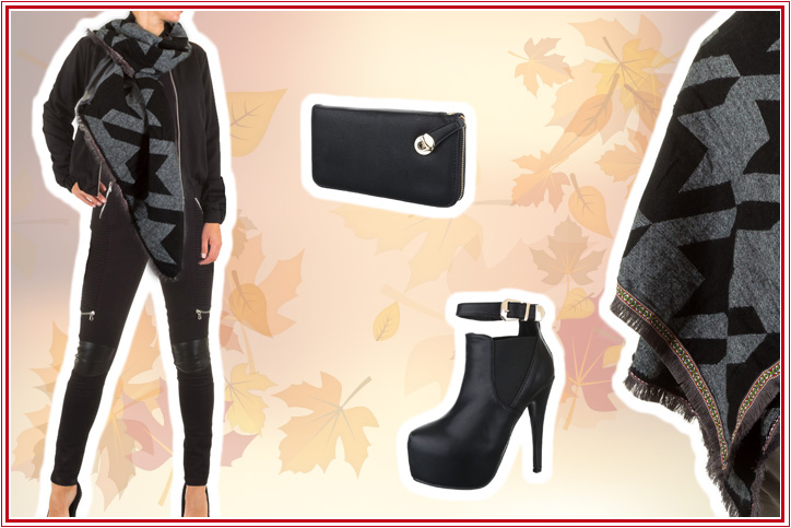 Auch in unserem zweiten kompletten Winteroutfit für Damen steht der große XXL-Schal voll im Mittelpunkt des Looks. Im Gegensatz zum ersten Style fungiert der große Damenschal in Grau und Schwarz hier aber weniger als gekonnte Auflockerung eines ansonsten sehr feminin-eleganten Stils, sondern vielmehr als zusätzliche Unterstreichung eines durch und durch rockigen Outfits. Dazu tragen nicht nur die schwarze Pilotenjacke für Damen mit kleinem Stehkragen und der richtig stylische schwarze Damen-Overall der Trendmarke Sixth June mit hohem Stretchanteil, zahlreichen Reißverschlussapplikationen und Kunstlederverstärkung im Kniebereich bei, sondern auch die rockigen Ankle Boots mit hohem Stilettoabsatz und einer goldenen Schnalle am Fesselriemen. Perfekt abgerundet wird dieser Look schließlich durch die kleine schwarze Geldbörse aus Kunstleder mit praktischer Handschlaufe.