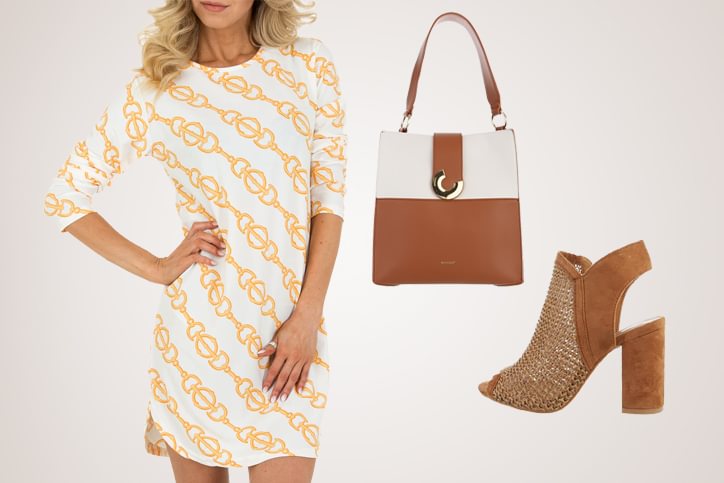 So geht minimalistische Eleganz! Dieses gerade geschnittene, weiße Midikleid aus super leichtem Material und mit schickem Muster ist ein echter Eyecatcher. Unterstrichen wird der feminine Charme dieses Looks auch durch die braunen High-Heel Sandaletten in hochwertiger Wildlederoptik und durch die elegante braun-weiße Schultertasche mit goldenem Magnetverschluss. Drei Teile, ein perfekter Sommerlook. Sichere Dir die Sandaletten, die Tasche und das Sommerkleid jetzt billig im Online-Shop von Ital-Design – einfach unten auf die Links klicken!
