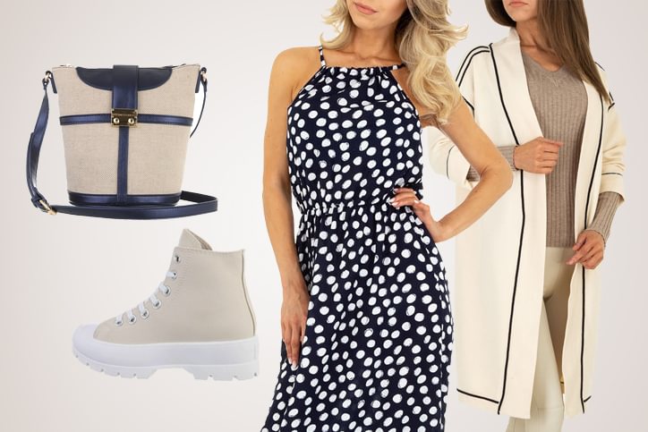 Und jetzt kommt etwas für wahre Fashionistas: In unserem zweiten Outfit kombinieren wir ein langes blau-weißes Sommerkleid mit beigen High-Top Sneakers mit Profilsohle. So geht Style 2021! Dazu gibt es noch eine tolle Schultertasche in hochwertiger Textiloptik und für die kühlen Abende eine Oversized-Strickjacke, ebenfalls in Beige. Mit diesem Look bist Du immer und überall im Zentrum der Aufmerksamkeit. Schau also mal, welche der Teile Du bereits zuhause hast und shoppe dann die noch fehlenden Items zusammen mit dem Sommerkleid billig online bei Ital-Design. Wir freuen uns auf Dich!