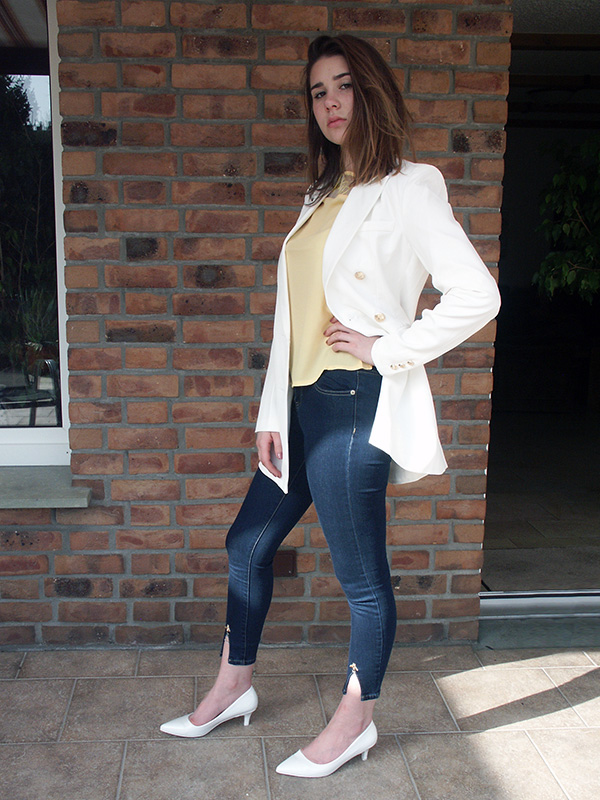 Mit unserem ersten kompletten Outfit mit Kitten Heels, das wir Dir heute präsentieren möchten, wirst Du automatisch zum Eye-Catcher beim nächsten Treffen mit Deinen besten Freundinnen! Und das liegt vor allem an dem figurbetonten, langen weißen Blazer mit goldenen Knöpfen, der farblich perfekt auf die weißen Pumps mit Kitten Heels abgestimmt ist. Markante Style-Elemente haben aber auch die anderen beiden Teile dieses Looks zu bieten: Die blaue Jeans ist aus herrlich weichem Stretch-Denim gefertigt und fällt mit ihrem Cropped-Stil sofort ins Auge, welcher die Kitten Heels besonders gut zur Geltung kommen lässt. Und die zarte gelbe Chiffonbluse überzeugt mit Dreiviertelarm und floralem Spitzeneinsatz am hohen U-Boot-Kragen. So wirst Du im Handumdrehen zur Lady! Bestell Dir am besten gleich die schicken Kitten Heels billig online bei Ital-Design und gönne Dir dazu noch weitere Teile dieses eleganten Outfits. Einfach unten auf die entsprechenden Links klicken und ganz bequem von zuhause aus losshoppen – so easy geht das!