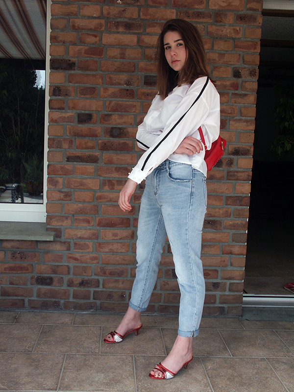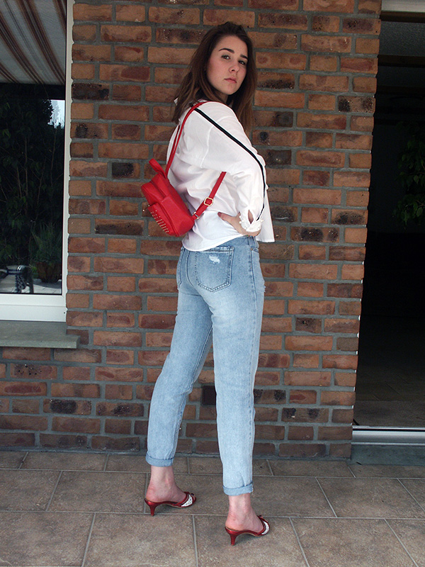 Unser zweites komplettes Outfit mit Kitten Heels zeigt Dir, wie gekonnt sich schicke Pantoletten mit kleinen Trichterabsätzen auch mit richtig legeren Looks kombinieren lassen. Auch alle vier Teile dieses Styles kannst Du Dir natürlich im Online-Shop von Ital-Design inklusive der Kitten Heels preiswert online kaufen, indem Du einfach den Links unten in den Shop folgst und dort nur noch Deine Größe und Lieblingsfarbe auswählst. Schau am besten gleich mal rein, ob Dein Lieblingspaar noch vorhanden ist. Doch nun zuerst mal zurück zum Outfit: Die eleganten rotten Pantoletten mit Kitten Heels und Strasssteinverzierung spiegeln sich farblich in dem kleinen roten Damenrucksack mit goldenen Nieten, der als Accessoire dem gesamten Style einen extrem lässigen Anstrich gibt. Dazu tragen aber genauso auch die verwaschene Bluejeans im Relaxed Fit mit Destroyed-Elementen und die legere weiße Oversize-Hemdbluse mit schwarzem Streifen bei. Dieser Look ist genau Dein Ding? Dann besuche uns jetzt im Shop und sichere Dir Deine Favoriten zu echten Schnäppchenpreisen – wir freuen uns auf Dich!
