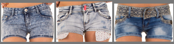 Ganz Rechts haben wir eine Jeansshorts für den eher dezent lieblichen Look. Durch die aufwendige Verzierung am Hosenbund und an den Taschen ist sie alleine so schon wirklich schick. Kombinieren kann man sie mit jeglichen Oberteilen, die sich allerdings dem femininen Look anpassen sollten. So ist zum Beispiel Pastell gefragt oder auch ein weißes T-Shirt mit Spitze.