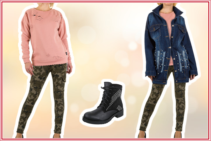 Unser erstes komplettes Herbst-Outfit für Damen mit Strasssteinstiefeletten bringt Dich für ganz kleines Geld ganz groß heraus! Die stylischen schwarzen Worker Boots mit Glitzersteinchen, schicker Schnürung und profilierter Sohle passen perfekt zur Skinny Jeans im Cargo-Look mit Camouflage-Muster. Die lässige lange Jeansjacke im Used-Look mit Perlenstickerei und Eingrifftaschen unterstreicht den absolut rockigen Charakter dieses Outfits, genauso übrigens wie das darunter getragene Sweatshirt in Apricot mit trendigen Cut-Outs. Und abgerundet wird der Style durch die farblich zu den Strassstein-Boots passende schwarze Schultertasche in hochwertiger Lederoptik mit herausnehmbarer Innentasche. So kann der Trend-Herbst kommen!