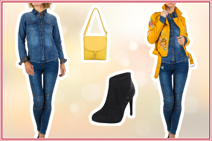 Jetzt zu den Details: Schon die eleganten schwarzen High-Heel Stiefeletten mit Glitzersteinverzierung machen deutlich, wohin die Reise mit diesem Look geht. Der feminine Charakter dieses Styles zeigt sich dann genauso auch in der schicken blauen Skinny-Jeans mit trendigen Ziernähten und auch im tailliert geschnittenen Jeanshemd mit angesagter Used-Waschung. Farbliche Highlights setzen dann die kleine gelbe Umhängetasche mit abnehmbarem Riemen und vor allem die richtig stylische gelbe Bikerjacke, die mit einem Blumenmuster bestickt und mit einem Ziergürtel versehen ist und so dem gesamten Outfit zusätzlich eine aufregende Note verleiht. So schick kann Dein Style mit Strassstiefeletten aussehen!