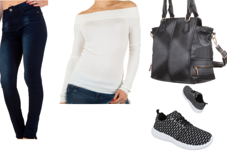 Der sportliche Aspekt bei diesem Trend sind die allseits beliebten Sneaker. Sie sind nicht nur ein Segen für die Füße, sie sehen auch noch cool aus. Damit haben wir eine dunkelblaue Jeans kombiniert, die sehr schlicht ausfällt und trotzdem sehr weiblich ist. Das Oberteil ist ebenfalls sehr schlicht und dennoch super sexy, da du durch die freien Schultern viel Haut zeigst. Es ist weiß und passt deshalb optimal zu den Schuhen, die das ganze Outfit durch das Design aufpeppen. Noch lässig eine sportlichere Tasche über die Schulter hängen und schon hast du den Trend wunderbar umgesetzt. Damit kannst du dich auf jeden Fall unglaublich wohl fühlen!
