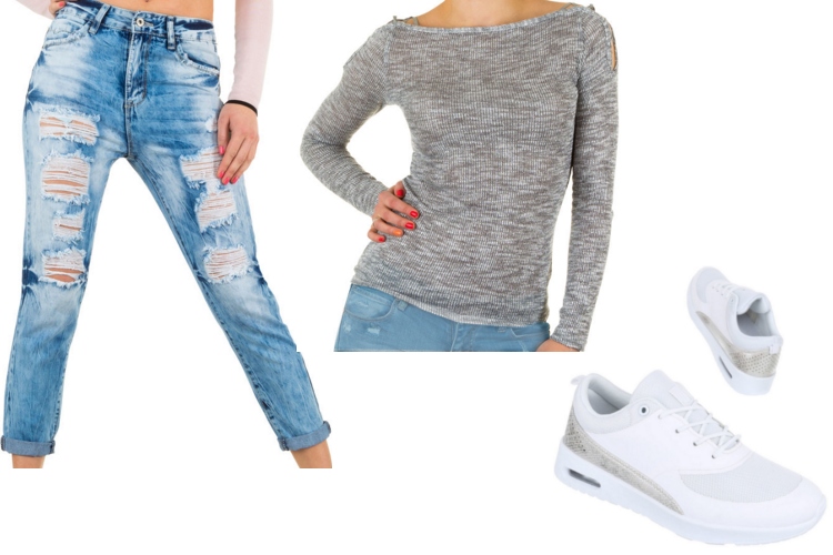 Bei diesem Outfit haben wir zu einer lockeren Destroyed-Jeans gegriffen, die an Lässigkeit nicht mehr zu übertreffen ist. Die freien Knöchel bieten die optimale Vorlage für Sneaker. Wir haben weiße gewählt, denn diese greifen die Waschungen der Jeans wieder auf. Der silberne Streifen an der Seite des Schuhs hat unsere Wahl eines hellgrauen Oberteils unterstrichen. Dieses fällt ganz bewusst eher schlicht aus, denn die coole Hose und die sportlichen Sneaker sollen ein Eyecatcher bleiben. Bevorzugst du also eher einen lässigen, coolen Stil, dann ist das Frühlingsoutfit genau das Richtige für dich. Es wird auf jeden Fall für neidische Blicke sorgen!