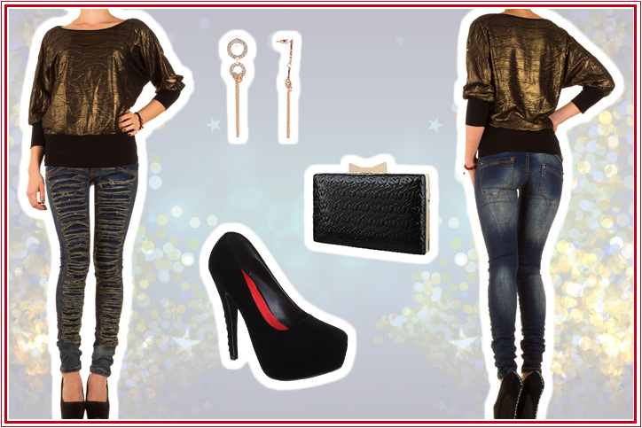 Alle Aufmerksamkeit garantiert: Mit diesem stylischen Outfit bist Du auf jeder Party vom ersten Moment an der Hingucker, und das aus so vielen modischen Gründen! Da wäre zunächst mal die richtig coole und nur bei Ital-Design so günstige Skinny-Jeans für Damen der Trendmarke Mozzaar, die in einem stark ausgearbeiteten Destroyed-Look und mit einer dunklen Waschung daherkommt. Und dann natürlich auch die wunderschön geschnittene Glanzbluse von Frank Lyman Design, welche mit tollen Lichtreflexen aufwartet. Das Schwarz des breiten Saums der Damenbluse spiegelt sich gekonnt im dunklen Farbton der aufregenden High Heel Pumps mit Stilettoabsatz, die das Bein der Trägerin elegant strecken, und in der kleinen Clutch Bag in hochwertiger Lacklederoptik. Diese setzt schließlich im Outfit zusätzlich, zusammen mit den Damenohrringen, kleine goldfunkelnde Highlights.