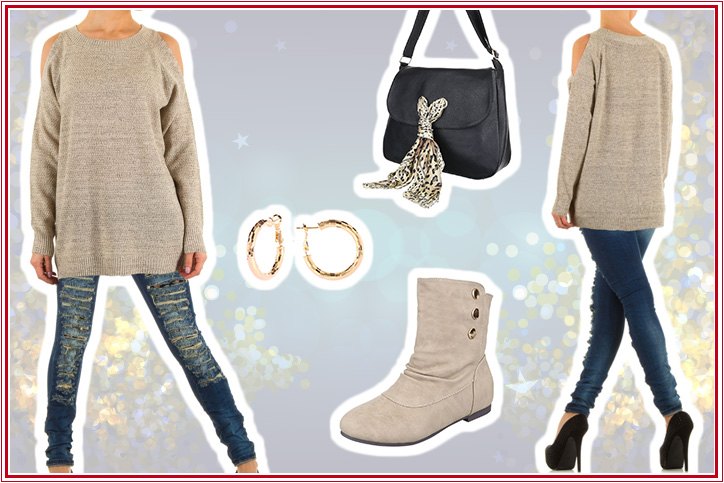 Doch zurück zum Outfit: Dieses kombiniert geschickt vier verschiedene Grundfarbtöne, die perfekt miteinander harmonieren. Das Beige des lässigen Off-Shoulder Strickpullovers für Damen findet sich sowohl in den bequemen Stiefeletten in hochwertiger Lederoptik mit flachem Absatz als auch in den Cut-Outs der trendigen Skinny Jeans für Damen und auch in dem kleinen Tuch wieder, welches an der eleganten schwarzen Schultertasche angebracht ist. Und das Gold der zierlichen Creolen spiegelt sich in den kleinen glänzenden Zierknöpfen der Stiefeletten. Den Fokuspunkt des Outfits bildet aber ganz eindeutig die in perfekter Passform geschnittene dunkelblaue Skinny Jeans für Damen, welche mit ihrem markanten Destroyed-Look einen wunderbar modischen Kontrapunkt zum ansonsten sehr weichen Casual Style dieses kompletten Winter-Outfits für Damen setzt.